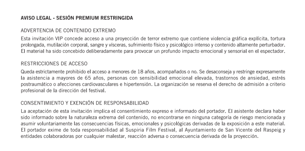 • Se recomienda no salir del recinto e informarse con el Staff del Suspiria Fest, ya que cuando el aforo se haya completado, no será posible acceder a la sala.